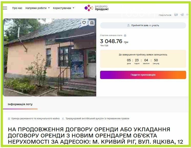 Подати цінові пропозиції можна до 1 грудня 2025 року (20:00). Сам аукціон запланований на 2 грудня 2025 року о 12:05.